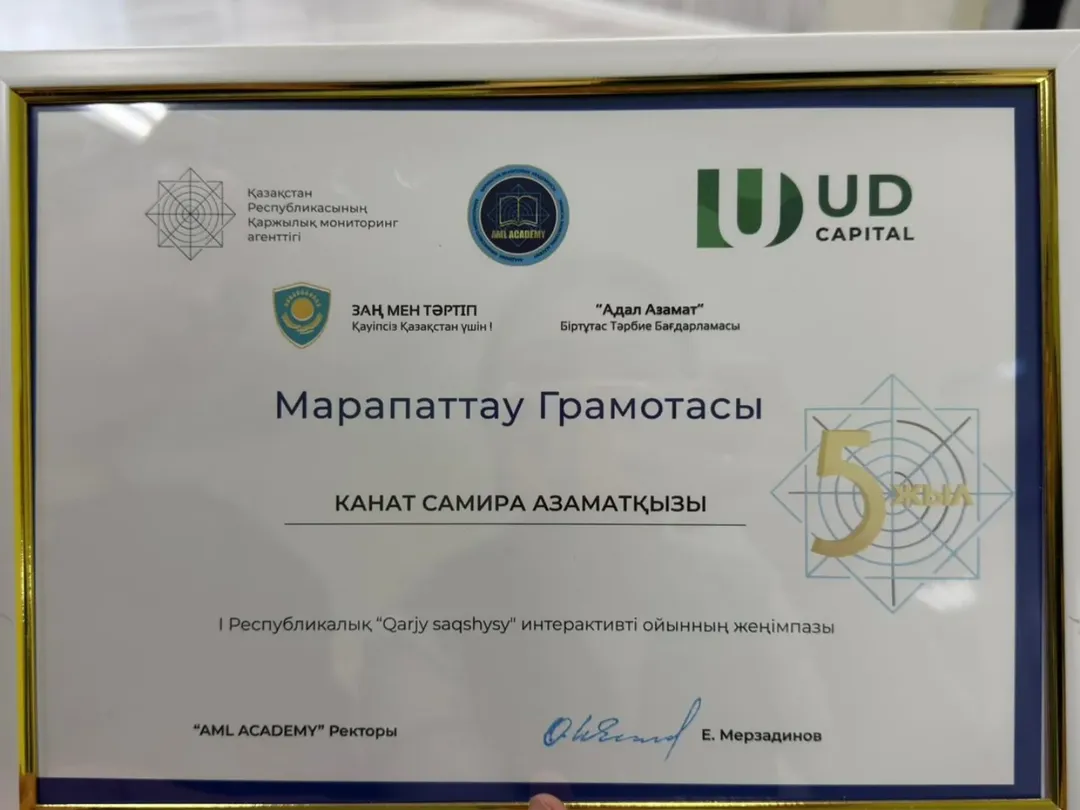 Солтүстік Қазақстан облысы Білім басқармасының тәрбие жұмысы бөліміның бас маманы Тұрлыбаева Замзагүл Болатқызы Экономикалық тергеп-тексеру департаментінің өкілдері — қызмет майоры Идрисов Диас Серікұлы және экономикалық тергеп-тексеру қызметінің подполковнигі Синякина Оксана Юрьевнамен бірге мектебімізге арнайы келіп, 10 «А» сынып оқушысы Қанат Самираны «Қаржы сақшысы (Qarjy saqshysy)» интерактивті білім беру ойынының облыстық финалының жүлдегері ретінде марапаттады.